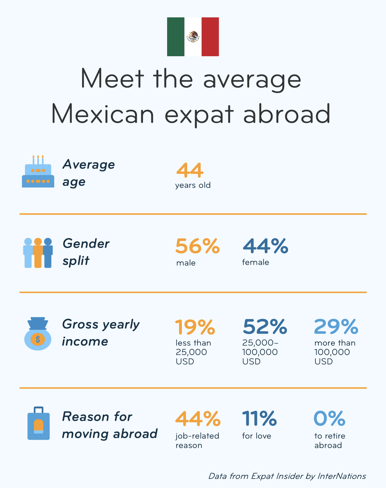 Every year, we publish one of the biggest global surveys among expats — asking them about various aspects of their life, from work to leisure. Learn what motivated our Mexican members to move abroad, what keeps them there, and what they struggle with or miss about home.