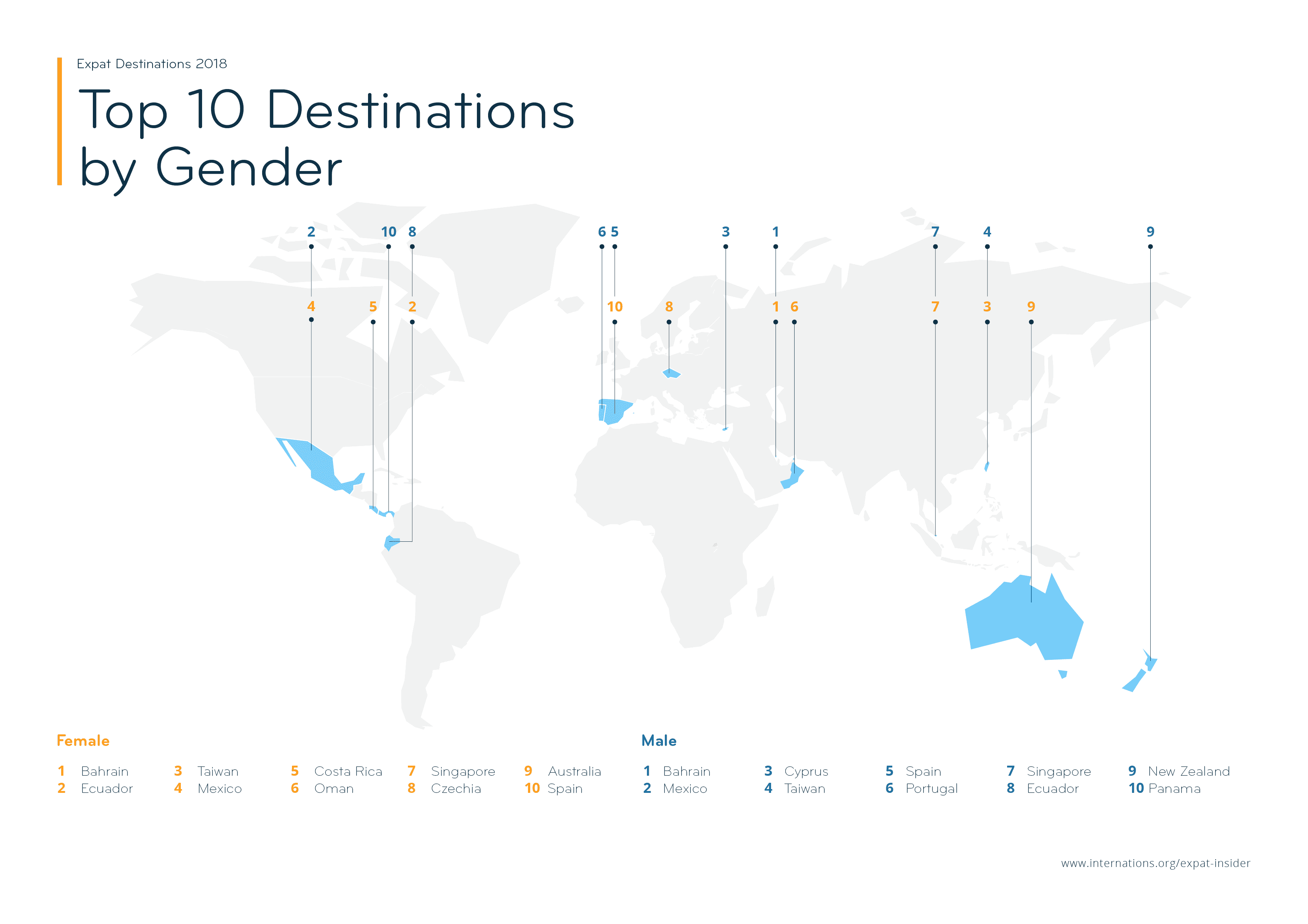 Have a look at the top 10 countries for expat women and men in the map below!