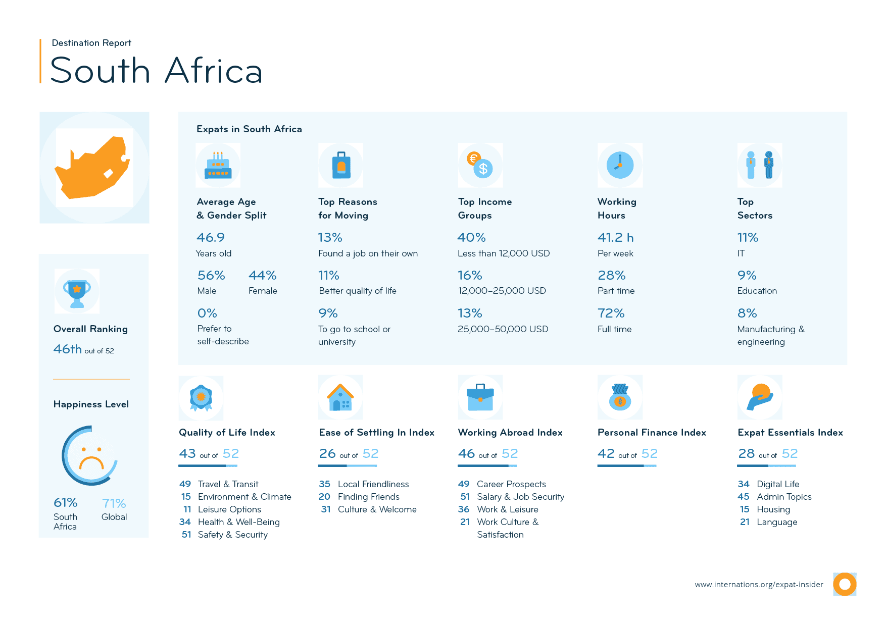 Lastly, South Africa performs best in the Ease of Settling In Index (26th). Expats are happy with their social life (59% vs. 56% globally) and find it easy to make local friends (46% vs. 42% globally). More than a quarter of expats (26%) are mainly friends with local residents (vs. 17% globally), and 56% describe their social circle as a fairly mixed group (vs. 49% globally). However, it seems like this is not the case for all of them: close to three in ten expats (29%) describe the local residents as unfriendly towards foreign residents (vs. 18% globally).