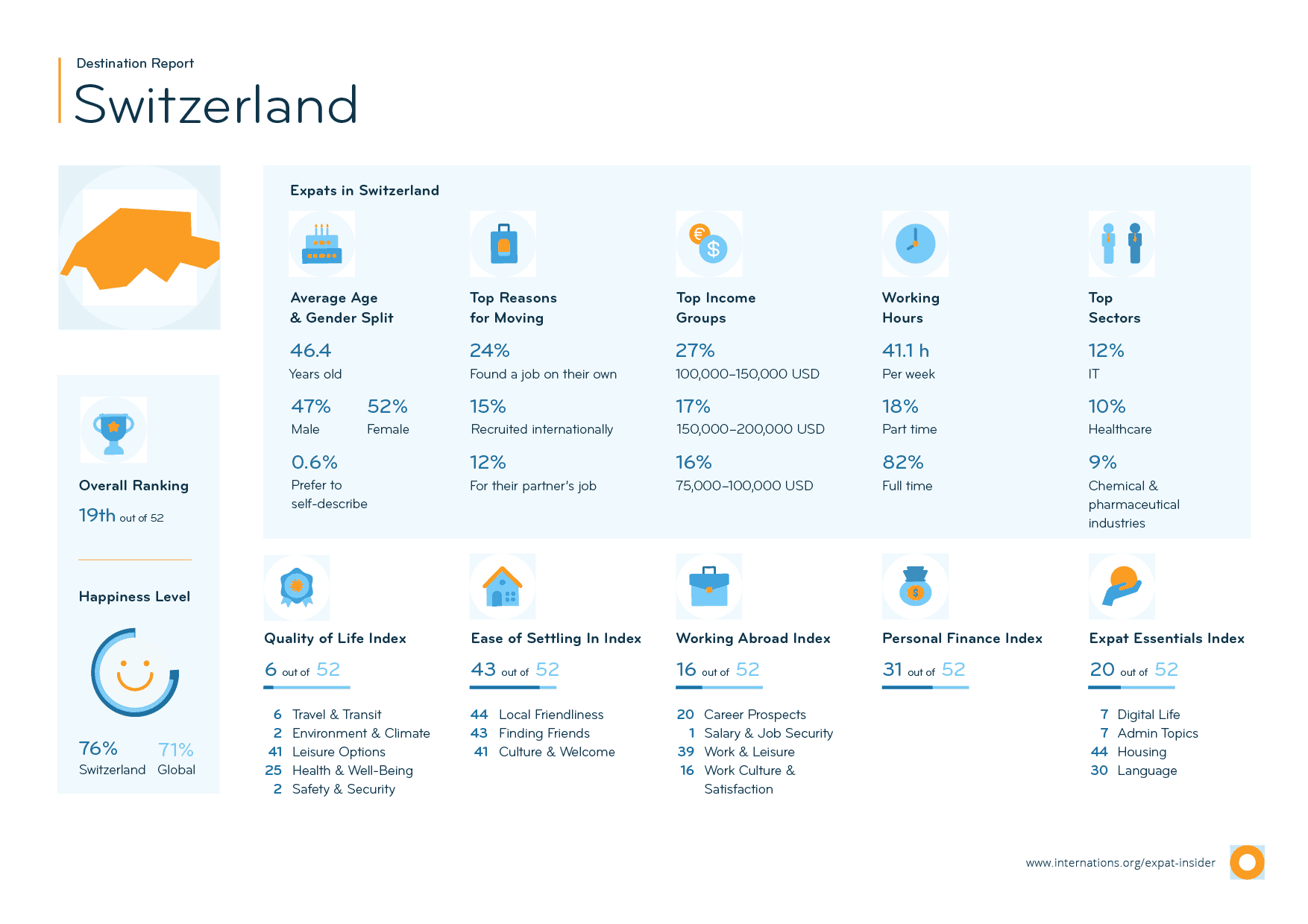 Switzerland places 16th in the Working Abroad Index — even first in the Salary & Job Security Subcategory. This is mostly due to the state of the economy: 94% are happy with it (vs. 64% globally). Moreover, 70% feel paid fairly for their job (vs. 62% globally), and another 65% agree that moving to Switzerland has improved their career prospects (vs. 60% globally).
