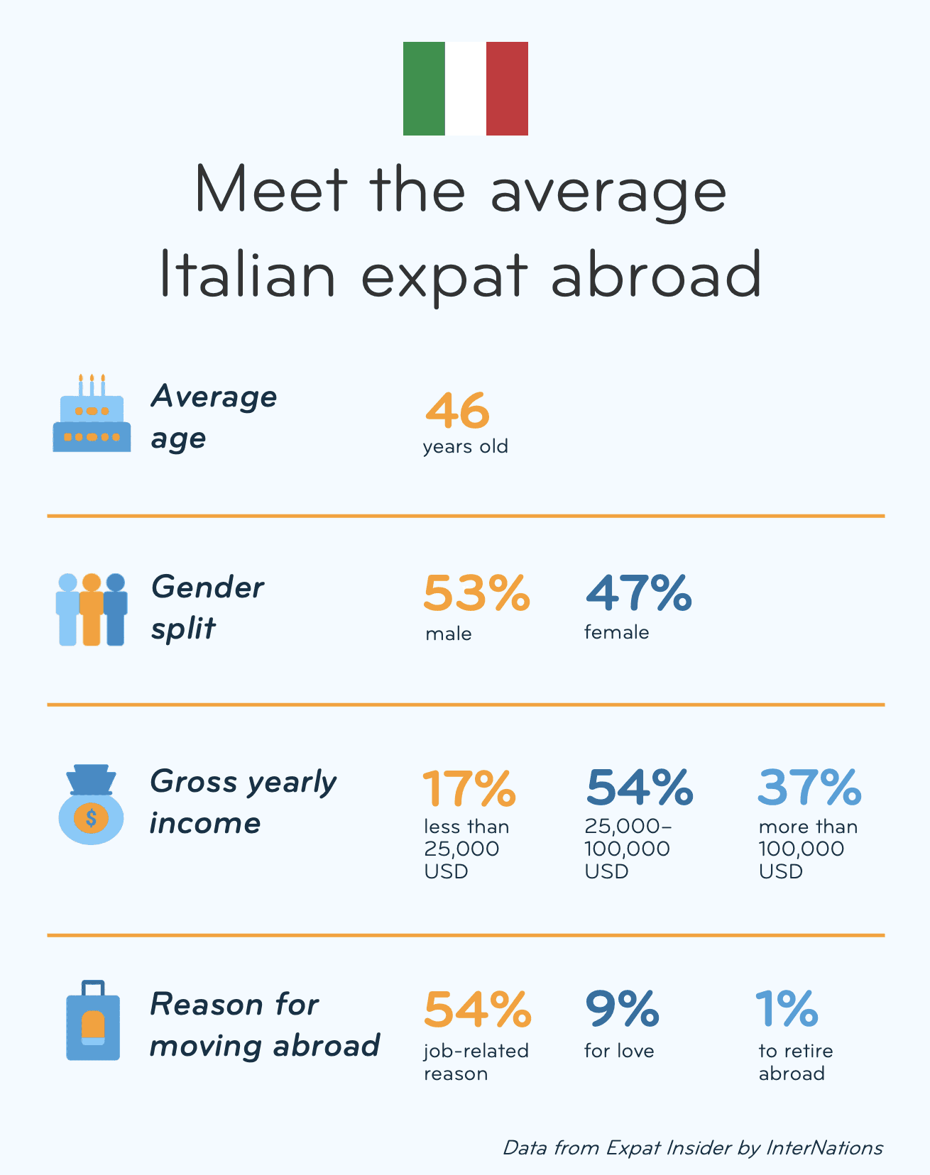 Every year, we publish one of the biggest global surveys among expats — asking them about various aspects of their life, from work to leisure. Learn what motivated our Italian members to move abroad, what keeps them there, and what they struggle with or miss about home.