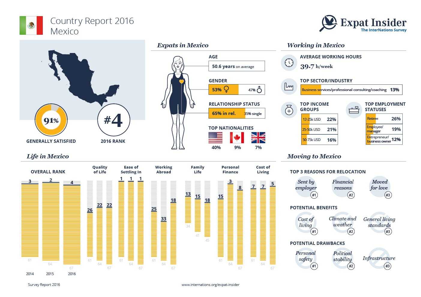 When asked about their main employment status, the largest group of respondents in Mexico (30%) actually indicates they are retired, perhaps explaining why 40% intend to stay possibly forever, nine percentage points more than the global average. Those working full time in Mexico work slightly more hours than the global average — 45.6 hours per week compared to 44.6. Despite potentially long hours, those working in Mexico are on the whole satisfied with their careers: the country is in second place in the Job & Career subcategory, with three-quarters of those who work in Mexico saying they are overall satisfied with their jobs. A quarter even cites complete satisfaction with their job compared to a global average of 16%.