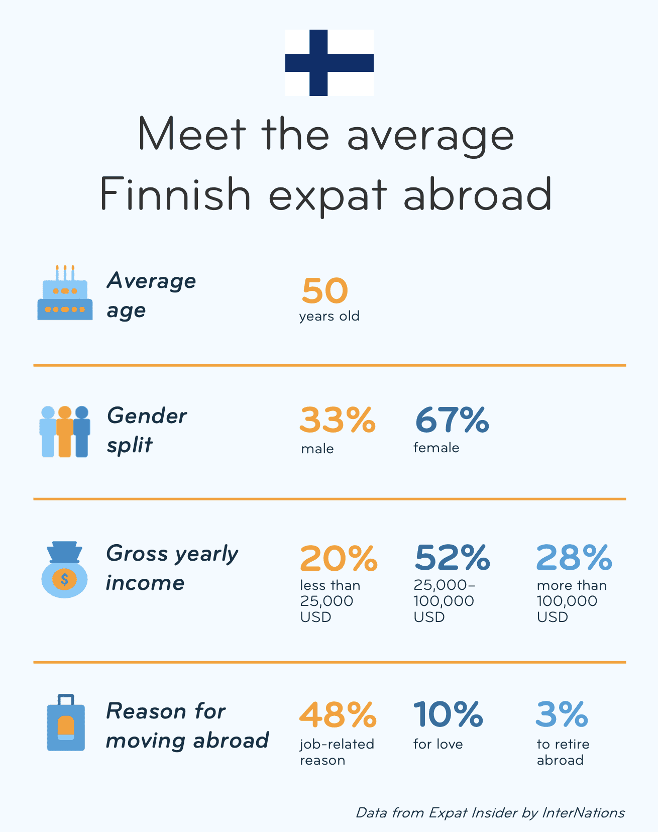 Every year, we publish one of the biggest global surveys among expats — asking them about various aspects of their life, from work to leisure. Learn what motivated our Finnish members to move abroad, what keeps them there, and what they struggle with or miss about home.